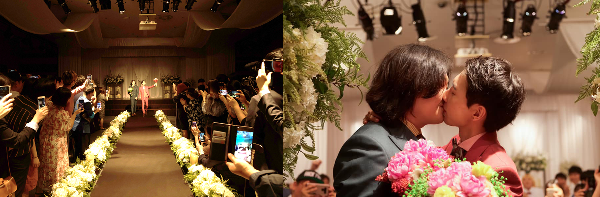 결혼식은 정말 평범하게 진행됐다. 주례 없이 진행됐다는 점이 조금 특별할 수도 있지만, 요즘은 많이들 주례 없이 진행하기도 하니까. 입장과 퇴장 때 신랑들이 춤을 추며 걸어갔던 게 조금은 특별했달까? 사전 영상, 입장, 다짐문 낭독 (우리는 혼인서약서라는 말 대신 ‘다짐문’이라는 말을 사용했다), 축사, 축가, 퇴장, 단체사진, 부케던지기. 그 어느 하나 크게 특별할 것 없이 평범했던 결혼식은, 그래서 더욱 특별하게 다가왔다는 하객들의 후일담을 들을 수 있었다. 결혼식장 한편에서 들리던 아기 울음소리, 사실은 조금 지루했던 곱단이 은사님의 축사, 평소와는 다르게 한껏 차려입고 온 지인들 등 모든 요소들 하나하나가 그냥 정말 평범한 결혼식 같아서 좋았다고들 한다. 사실 우리는 더 특별한 요소들을 넣어서 재밌는 결혼식을 만들고 싶었는데 그러기에는 1시간이라는 식 진행 시간은 너무나 짧았다. 일반 식장을 대관했으니까 그 정도는 감수해야겠지만.