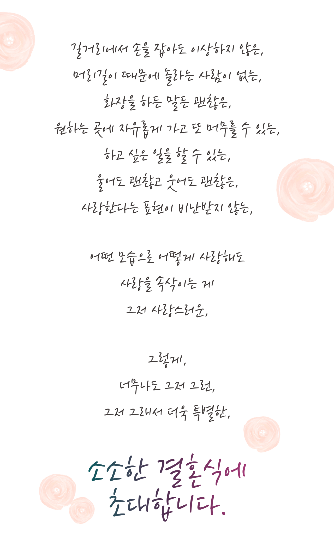 일견 평범한 청첩장이지만, 우리의 지인들에게는 그저 평범하게만 다가오진 않았나보다. 청첩장을 받고 초대 문구를 읽으며 눈물을 훔친 사람들이 많았다. 그 마음 하나하나 헤아려볼 수는 없지만, ‘성소수자에게도 결혼은 가능한 것’이라는 걸 보여주고 싶었던, 내가 가진 결혼식의 목적 중 하나는 충분히 달성할 수 있었던 것 같다.