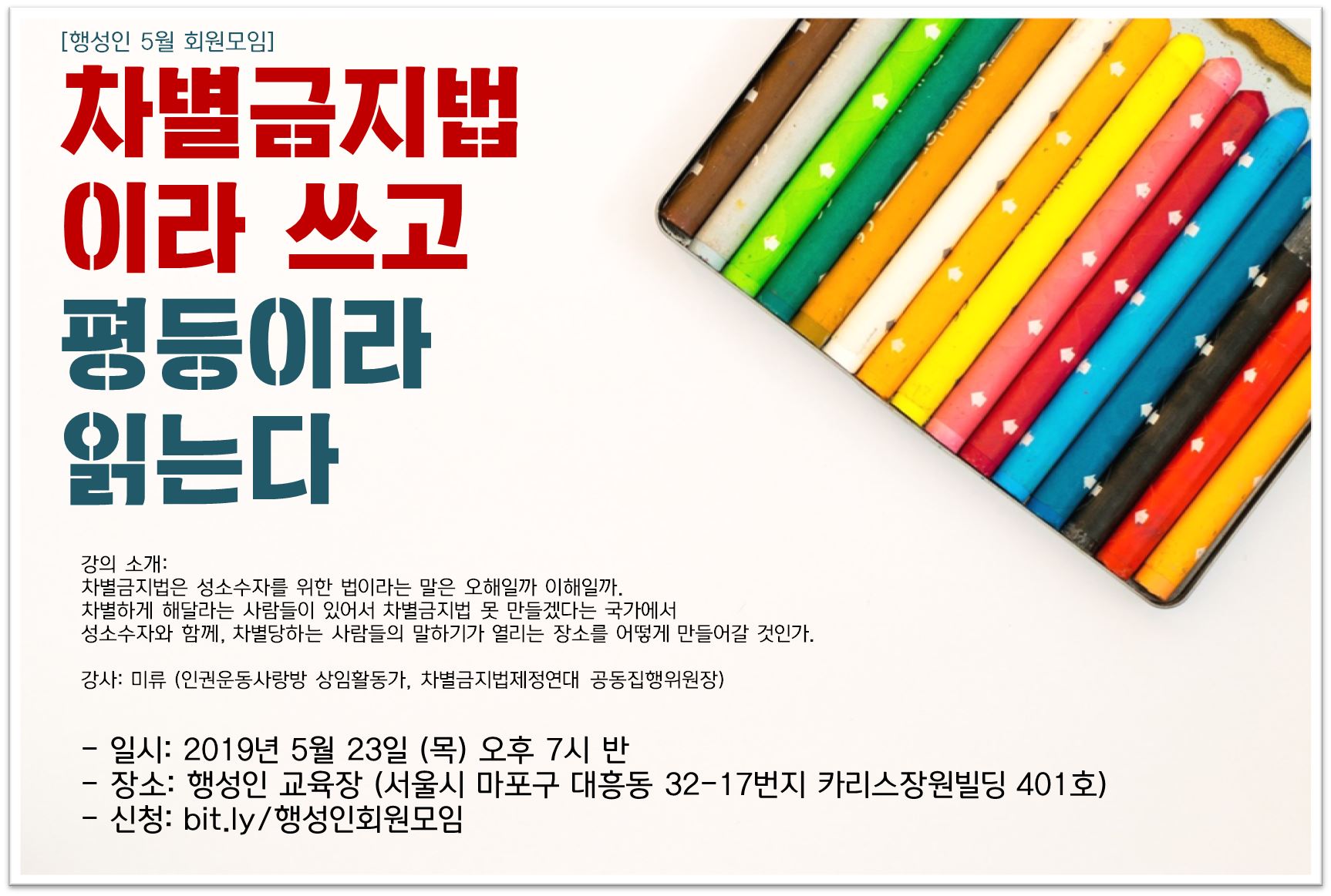 2019년 5월 23일에는 차별금지법에 대해 이야기 하는 회원모임 <차별금지법이라 쓰고 평등이라 읽는다> 강연이 있었다. 6월 1일 퀴어문화축제에서 행성인은 퍼레이드 차량을 차별금지법제정연대(이하 차제연)와 함께 준비했기에, 퀴퍼 전 회원들과 차별금지법(이하 차금법)에 대한 이해를 높이는 시간을 가진 것이다. 차금법 강연은 차제연 공동집행위원장 미류님께서 맡아주셨다.