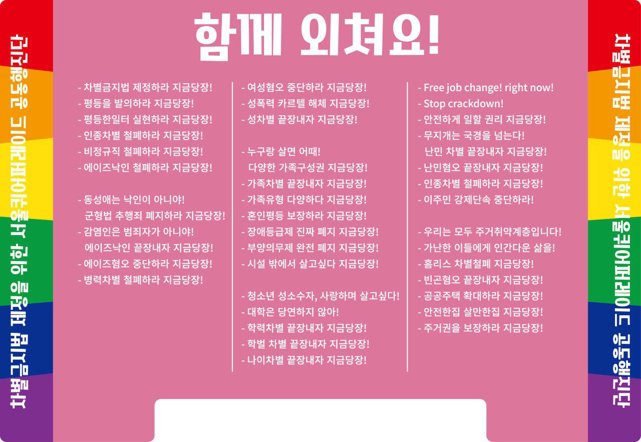 더욱이 소중한 것은 성소수자 자긍심의 날, 성소수자 뿐만 아니라 여성, 장애, 이주민, 빈곤, 노동, 청소년, 홈리스 등 다양한 이들이 함께 하였다는 것이다. 그리고 서로의 얼굴을 마주하고 곁에 있는 이들을 확인했다는 것이다. 다양한 이들의 연대가 큰 힘이고 서로의 존재가 소중함을 상기할 수 있었다. 이것은 이후 지속될 반차별운동, 차별금지법제정운동에서도 마찬가지일 것이다.