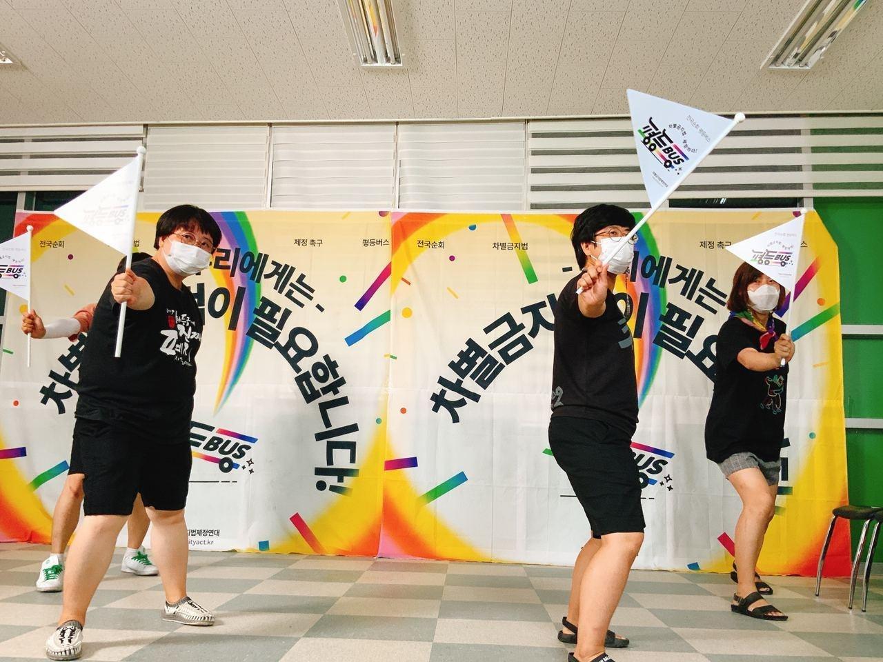 한편 평등버스의 여정은 폭염이 내리쬐고 태풍이 올라오고 무엇보다 코로나19의 확산에 따라 더없이 조심스러운 여정이었습니다. 방역을 전담했던 활동가의 시름은 날로 깊어지고 지역 일정은 때에 따라 계속 수정되며 문화제에는 사람들을 초대하기가 어려웠어요. 평등버스에 탑승한 10여 명의 여정이 아니라 평등을 열망하는 모든 한 명 한 명의 여정임을 알기에 더욱 사람들이 함께 모이지 못했던 것이 아쉽기도 합니다. 당초 행성인에서는 매 문화제마다 운영위원들이 돌아가며 문화제에 깃발을 올리기로 했었어요. 지역에서 차별금지법을 이야기하는 자리에 성소수자들이 한 데 모인 작은 축제가 되기를 바랐었지요. 아쉽게도 대전과 천안에서만 진행할 수 있었습니다.