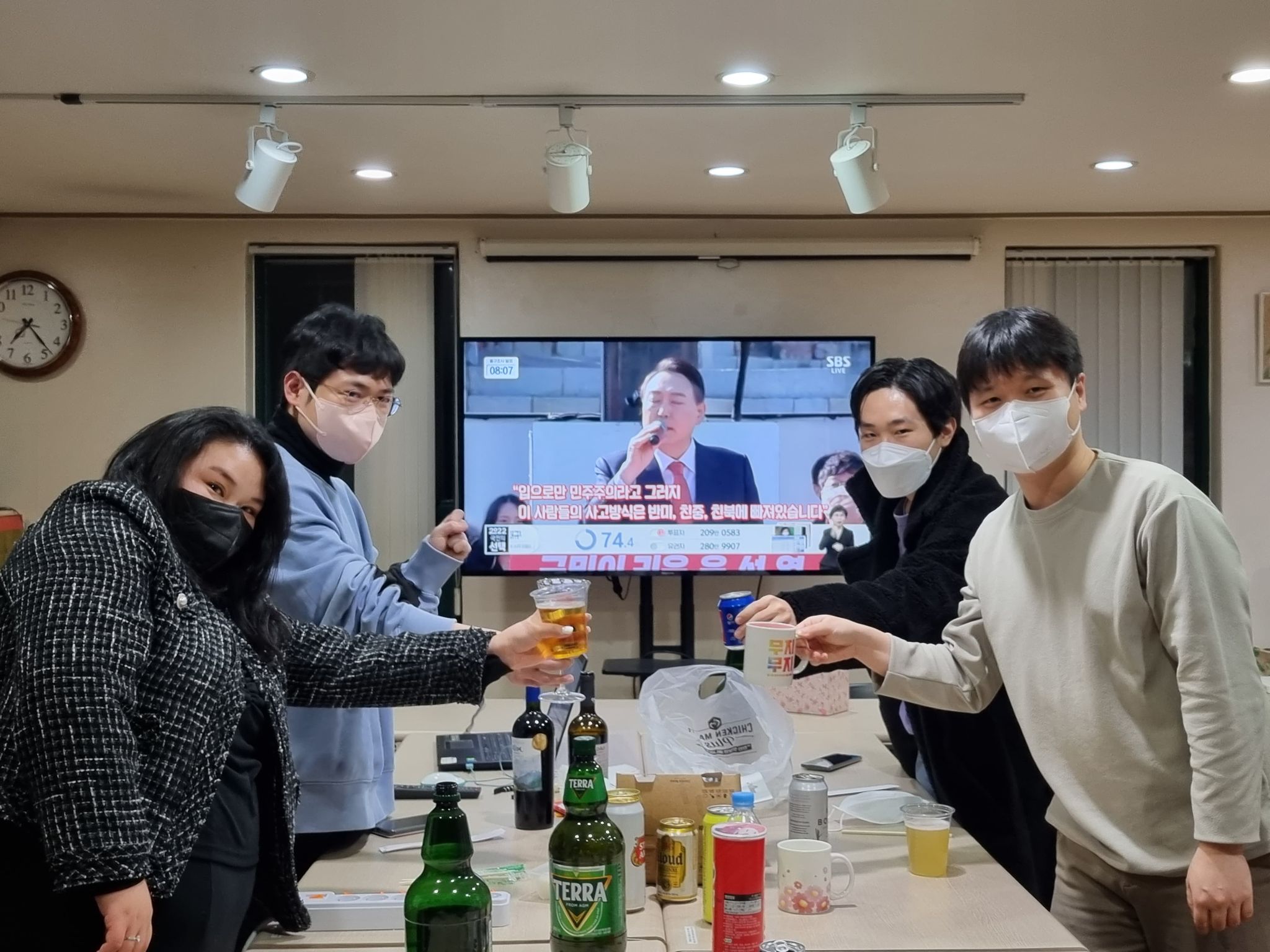 마루: 대선 결과에 대한 큰 기대는 없지만, 그래도 결과가 궁금해서 같이 이야기하면서 출구조사결과랑 개표방송을 같이 보고싶어 오게 되었다.