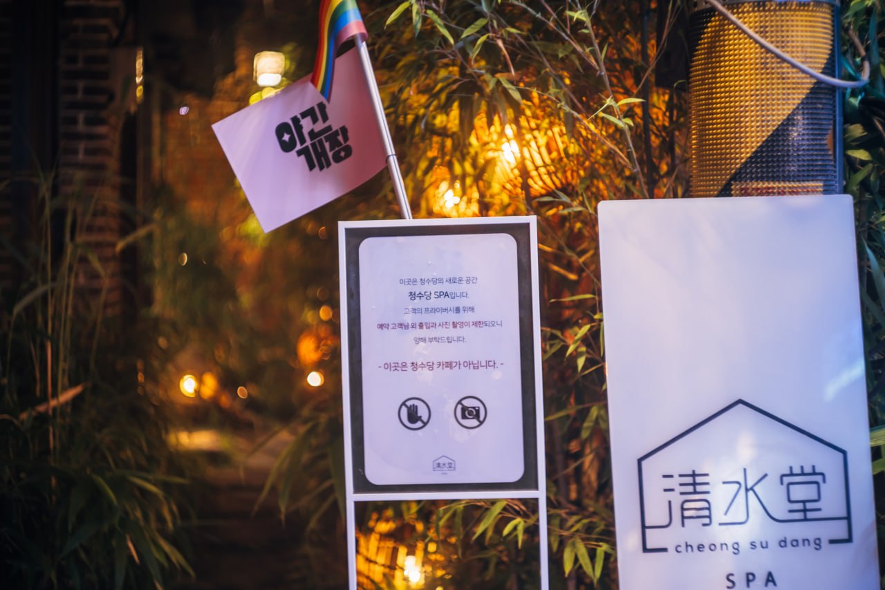 에이주를 만들고, 손님들에게 퀴즈와 문진표를 작성하게 하고, 예약프로그램을 만들어 관리하고, 대화를 나누는 일들은 생각보다 운영이 까다롭고 많은 손을 필요로 했습니다. 하지만 한껏 뽐내고 나온 게이들 뿐 아니라 복잡한 익선동을 배회하다가 들어온 퀴어들이 한 공간에 섞여 에이주를 마시고 땀을 식히면서 분위기를 즐기는 풍경은 내심 신기하기도 했어요. 무엇보다 우아하고 아늑한 청수당 스파의 공간마다 HIV/AIDS운동 구호가 담긴 피켓들을 붙여놓은 풍경은 어색하면서도 제법 어울리는 것 같기도 했답니다. 많은 PL(People Living with HIV/AIDS) 여러분들이 찾아와 자신도 PL이라 웃으며 말해줄 만큼 편안하게 어울리고 대화를 나누는 모습은 오랫동안 기억에 남을 것 같아요. 우리가 원하던 공간이 이런 모습 아니었을까 잠시 상념에 젖어들었습니다.