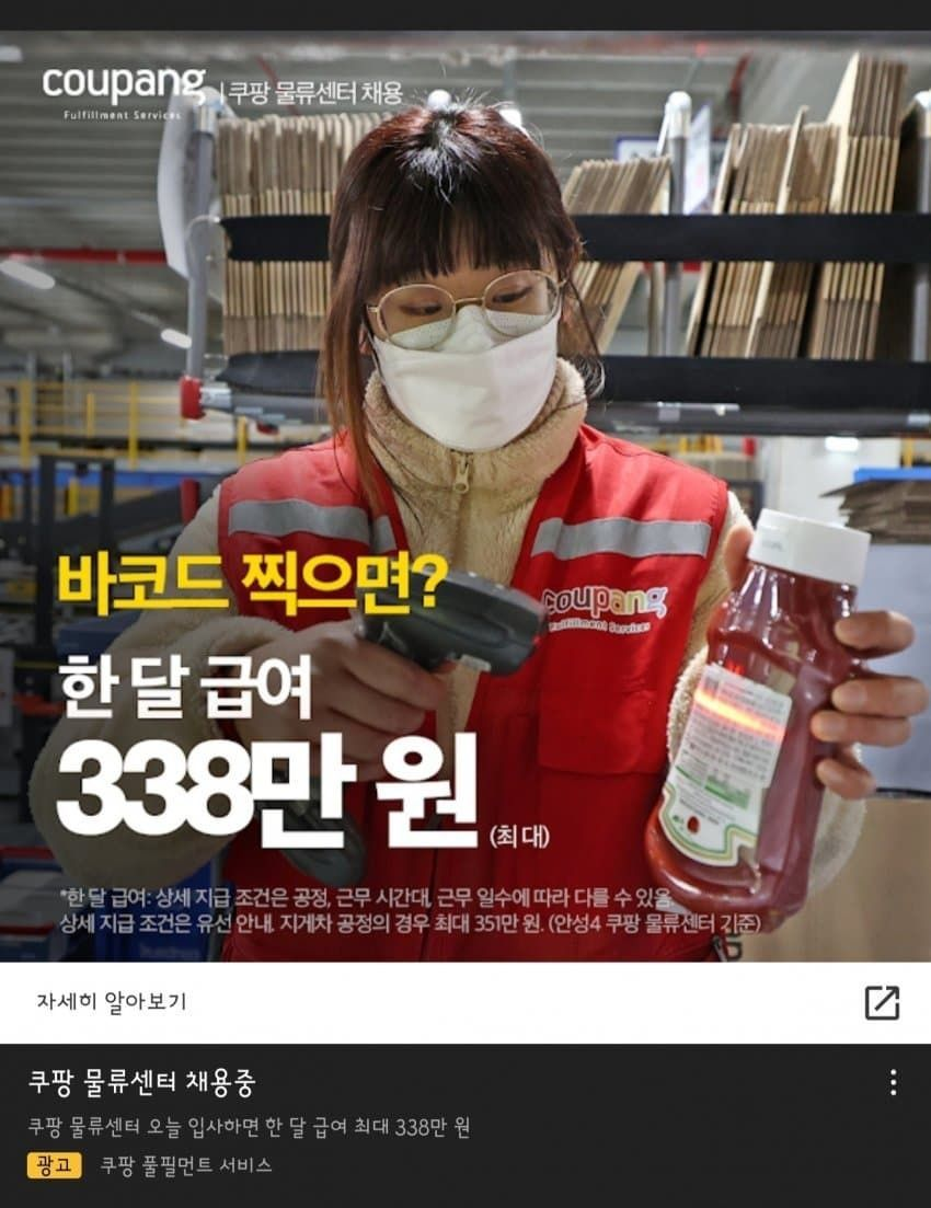 쿠팡 물류센터에서 일하면서 월 338만 원을 버는 것이 실제로는 어렵다는 것은 쉽게 추측할 수 있습니다. 홍보 이미지에도 법정 공방을 피하고자 아주 작은 글씨로 “최대”라는 조건이 붙어있기 때문입니다. 이러한 명백한 거짓말만큼 제 머릿속을 착잡하게 만든 것은 이 홍보 문구에서 드러나는 차별적인 인식이었습니다. “바코드 찍으면”이라는 문구는 물류센터 노동을 단순하고 쉬운 작업인 것처럼 포장합니다. 그 문구와 나란히 놓인 “한 달에 338만 원”이라는 큰 액수는 역설적으로 우리가 노동이 적절한 보상을 받지 못하는 사회에 살고 있다는 것, 그리고 우리 사회에서 전문성과 숙련도가 요구되는 것처럼 보이지 않는 노동은 천대받는다는 것을 드러냅니다.