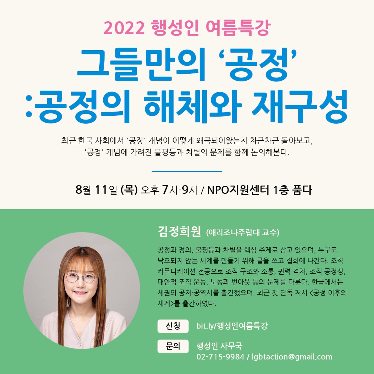 이제는 공정이라는 단어가 지긋지긋했다. 인터넷 뉴스에서 공정이라는 단어가 보이면 실수로라도 누르지 않았다. 그런데 김정희원님은 달랐다. 김정희원님은 우리의 곁에서 공정을 말하는 사람이었다. 그래서 2022 행동하는성소수자인권연대 여름특강에서 김정희원님이 '그들만의 공정: 공정의 해체와 재구성' 을 주제로 강의한다는 소식을 들었을 때 냉큼 신청할 수 밖에 없었다. 지난 8월 11일 저녁에 진행된 김정희원님의 강의는 최근 인국공 사태부터 할당제·여가부 폐지 주장, 이대남에 이르기까지 수많은 소용돌이를 만난 나에게 통쾌함을 주는 강의였다.