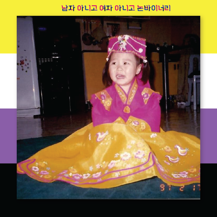 내가 (아마도) 처음으로 젠더 디스포리아를 경험했을 때의 사진이다. 25개월이었고, 여자 색깔의 여자 옷이 입혀졌다는 것이 불쾌해서 울음을 터트렸다. 어린 내가 한복이 아니라 다른 것을 불편해 했다는 것을 양친은 몰랐다. 지금도 모른다. 이후로 주어지는 모든 여아용을 거부했지만, 그 대신 남아용이 주어지는 것에도 석연치 않아 하며 자랐다. 남자와 여자로 이분된 화장실을 이용할 때마다 미묘한 굴욕감과 모멸감, 자기혐오가 얕게 쌓여갔다. '젠더' '퀴어' '디스포리아' '논바이너리' 이런 용어들을 하나도 알지 못한 채 청소년기에 정체화를 했다. 어느 쪽도 아닌 사람으로.