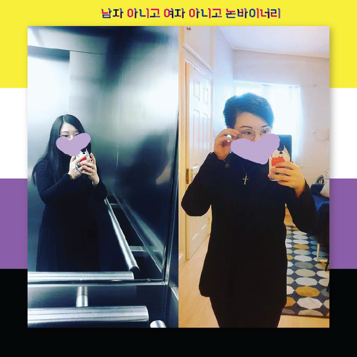 저는 사회에서 말하는 '여성적인' 모습의 논바이너리 입니다. 사람의 겉모습으로는 그 사람의 젠더를 파악 할 수 없습니다. 중성적인 외형만이 논바이너리의 모습이 아닙니다. 세상에는 다양한 논바이너리들이 많고 모두 존중받고 사랑받을 가치가 있습니다:)