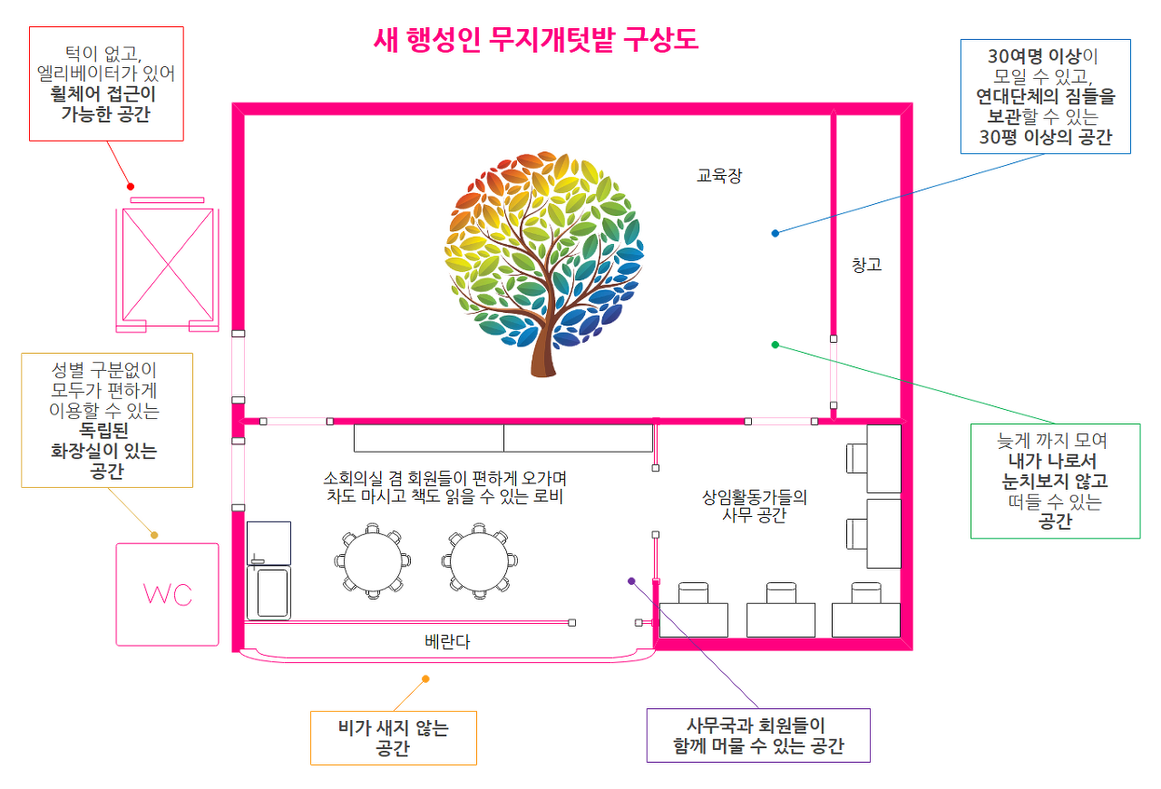 활동하면서 후회되는 순간들이 여럿 있는데, 그중에 하나가 행성인(당시엔 동성애자인권연대)이 충정로에서 홍대로 이사갈 때 있었던 일이다. 당시 행성인은 새로운 활동 회원들이 많아지면서 더 좋은 사무실을 찾아다녔다. 예산에 맞으면서 접근이 쉽고, 크고, 엘리베이터가 있고, 턱이 없는 사무실들을 찾아 다녔다. 하지만 우리가 꿈꾸던 공간은 현실에 없었다. 그나마 비슷하게 찾아볼 수 있었던 후보들은 다들 어느 한 가지를 만족하지 못했다. 너무 비싸거나, 엘리베이터가 없거나, 대중교통으로 접근하기에는 너무 멀거나 등등. 그래서 회의를 했다.