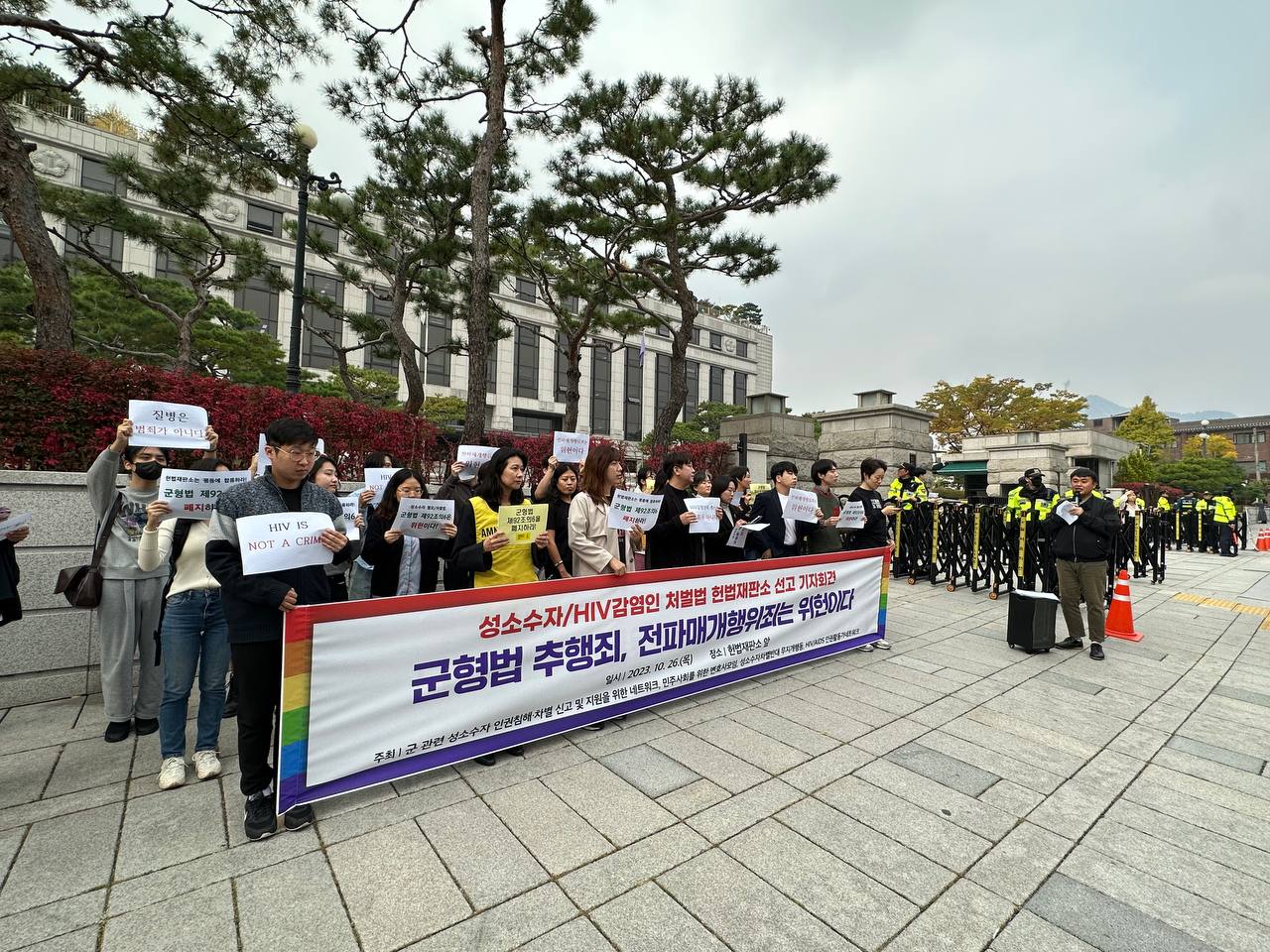 헌법재판소는 사회적 약자와 소수자 보호에 앞장서야 할 책무가 있습니다. 헌법재판소는 지난 세 번의 결정을 통해 본연의 책무를 져버렸습니다. 2016년 마지막 합헌 결정 이후 7년이 지난 오늘, 잠시 후 2시면 군형법 제92조의6의 위헌여부에 대한 네 번째 선고가 진행됩니다. 헌법재판소가 부디 지난 과오를 되풀이하지 않기를 바랍니다. 앞선 대법원 판결의 취지를 적극 참작하고 학계 및 시민사회와 국제 인권기구들의 지속적인 지적을 받아들여 헌법과 보편적 인권기준에 걸맞는 정의로운 판단을 내리기를, 군형법 제92조의6에 대한 위헌 결정을 내리기를 촉구합니다.