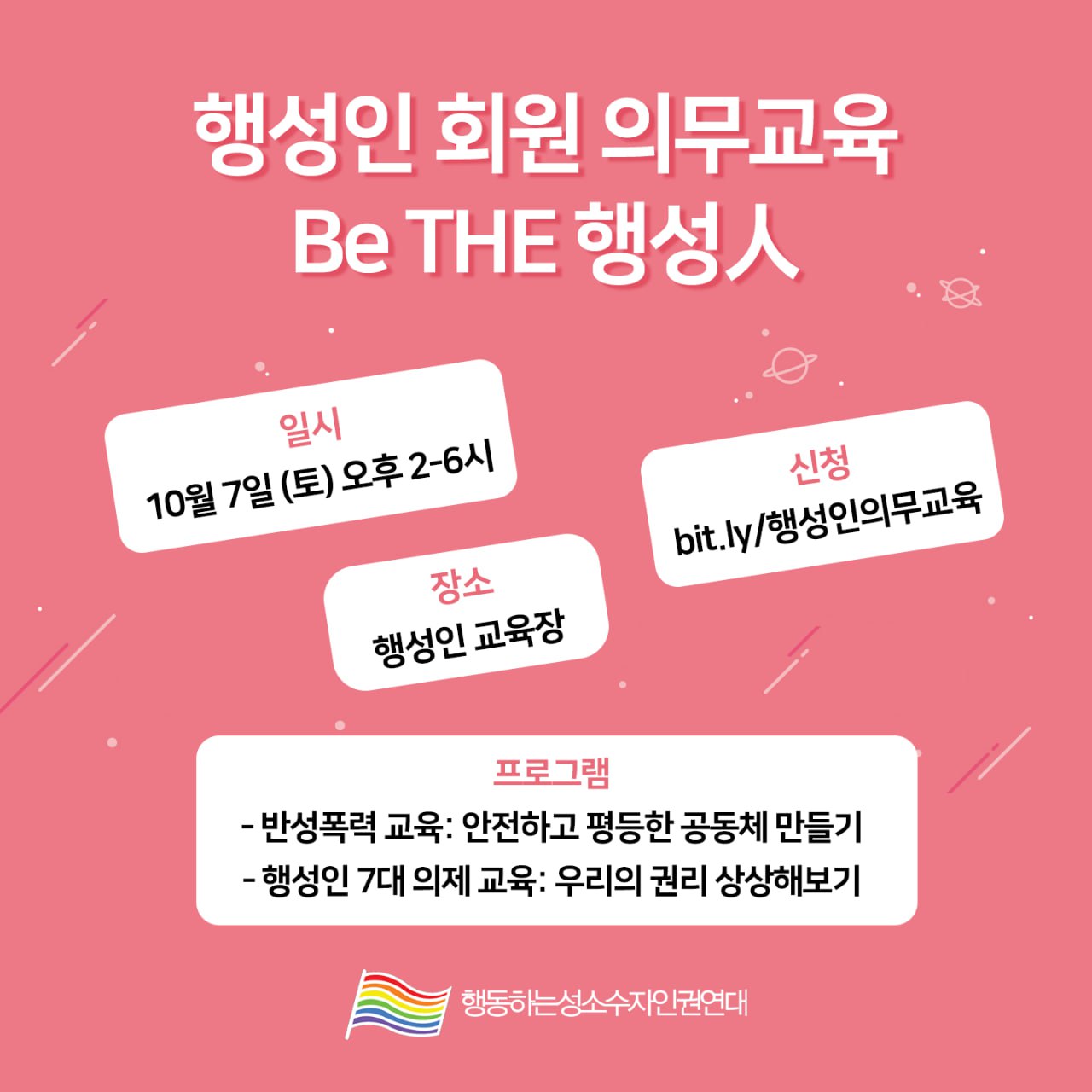 지난 10월 7일, 행성인 회원 의무교육이 진행되었습니다. 의무교육은 단체의 활동과 지향에 대한 이해를 돕고, 민주주의적 의사소통과 성/평등 감각을 높이고자 진행됩니다.