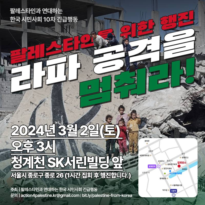 가자지구 사망자가 3만여명에 달하는 현재까지도 공격은 계속되고 있습니다. 하루빨리 휴전이 이뤄질 수 있도록 다음 집회인 3월 2일에도 많은 참여 부탁드립니다. 이 날은 범세계적인 연대 행진이 있다고도 합니다. 하단의 포스터를 참고해주세요.