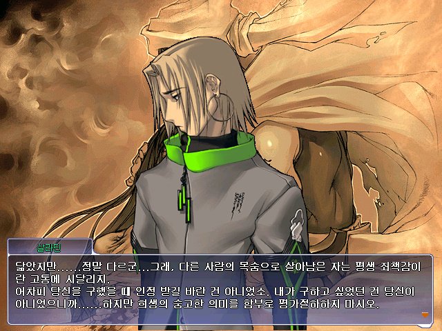 살라딘 : 닮았지만... 정말 다르군... 그래, 다른 사람의 목숨으로 살아남은 자는 평생 죄책감이란 고통에 시달리지. 어차피 당신을 구했을 때 인정 받길 바란 건 아니었소. 내가 구하고 싶었던 건 당신이 아니었으니까... 하지만 희생의 숭고한 의미를 함부로 평가절하하지 마시오.