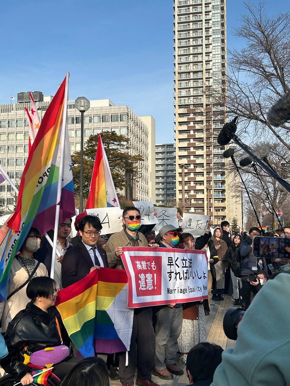 | “모두에게 결혼의 자유를” 소송 삿포로 항소심 결과를 알리는 원고인단과 변호인단 (출처: 모두의결혼) 2019년 2월 14일, 발렌타인데이를 맞아 일본 전국 5개 지역(도쿄, 나고야, 후쿠오카, 오사카, 삿포로)에서 13쌍의 동성부부가 동성혼을 인정하지 않는 것은 헌법위반임을 주장하며 제기한 소송이다. 2021년 3월 27일 도쿄에서 8명의 원고가 추가로 소송을 제기하여 현재 6개의 소송이 진행 중이다. 소송의 쟁점은 동성혼의 불인정이 일본 헌법 14조(평등권)과 24조 1항(혼인의 자유), 2항(혼인과 가족생활의 권리) 등의 조항을 위반하는지 여부다. 지난 5년 간 이어진 소송과 운동을 통해 마리포재팬과 대리인단, 원고들은 제도로부터의 배제가 동성부부와 성소수자의 삶에 미치는 영향이 무엇인지, 혼인평등이 왜 헌법적 권리인지를 입증해왔다. 그리고, 오사카 소송을 제외한 4개의 소송(도쿄 1차, 나고야, 후쿠오카, 삿포로)의 1심에서 동성혼의 불인정이 일부 헌법 조항을 위반한 위헌 혹은 위헌상태임을 확인하는 판결이 이어졌다. 하지만 그동안 혼인의 자유를 규정한 24조 1항의 위반을 인정한 판결은 없었으며, 항소심 판결도 없었다. 모두의 결혼이 출장을 다녀온 3월 14일, 도쿄 2차 소송과 삿포로 항소심 판결이 있었다. 14일 오전에 판결이 나온 도쿄 2차 소송의 경우 아쉽지만 동성혼 불인정이 성적지향만이 아니라 성별정체성에 기반한 차별임을 추가로 인정한 것을 제외하면 24조 2항을 위반한 ‘위헌상태’임을 확인한 도쿄 1차 소송에서 크게 나아가지 않았다. 하지만, 같은 날 오후 삿포로 항소심에서 그동안 한번도 인정되지 않았던 24조 1항의 위반을 포함하여 주장하는 모든 조항의 위헌을 확인하며 이 날을 일본 혼인평등운동의 중요한 역사적 순간으로 만들었다. |