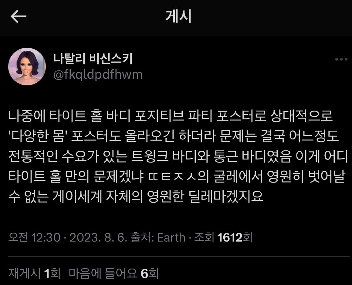 그리고 언더웨어 파티 유행에 처음 참여한 T 모 클럽은 앞선 사례와 다르게 모든 몸을 환영한다고 클럽 측에서 밝히고 있다. 하지만 이러한 환대는 클럽 참여자에 도달해선 작동하지 않는다. 클럽측이 설명한대로 모든 몸에 수요가 있는건 당연하지만, 위의 후기처럼 어느정도 유의미한 수요여야지 클럽의 언더웨어 파티까지 올만한 규모가 되기 때문이다. 누구에게나 기회는 열려있지만, 선택은 한정적이다. 분리하되 평등한 세상이 게이들에게도 닥친것이다. 하지만 불평등한 기준으로 분리한다는 걸 대부분의 게이들은 까먹은채 이 세상이 평등하다며 믿는다. 그 누구도 섹스와 욕망에 대한 기준을 객관적으로 제시한 적 없는 데 말이다.