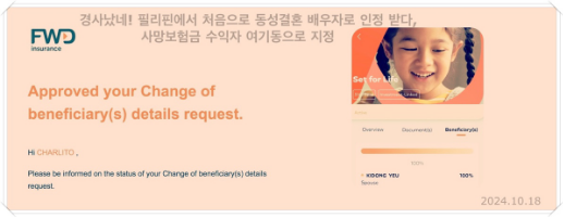 그런데 이게 웬일입니까. 그냥 아무 소리 없이 직원이 변경해 주는 겁니다. 기존에 지정되었던 조카를 삭제하고 제가 등록된 것입니다. 과거에 민간 보험회사 3곳에서 사망 시 수익자를 저로 지정받았는데 국가기관에서 인정받은 것은 이번이 처음이었습니다. 우리 부부가 이곳 필리핀에서 배우자/파트너로 인정받았던 몇 가지 사례를 들려드릴까 해요.