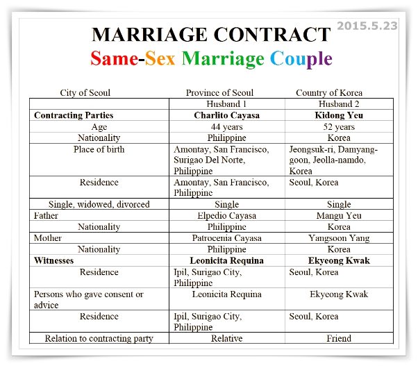 우리는 결혼계약서를 통해 서로의 동성결혼 배우자 권리를 보호하고자 하며,