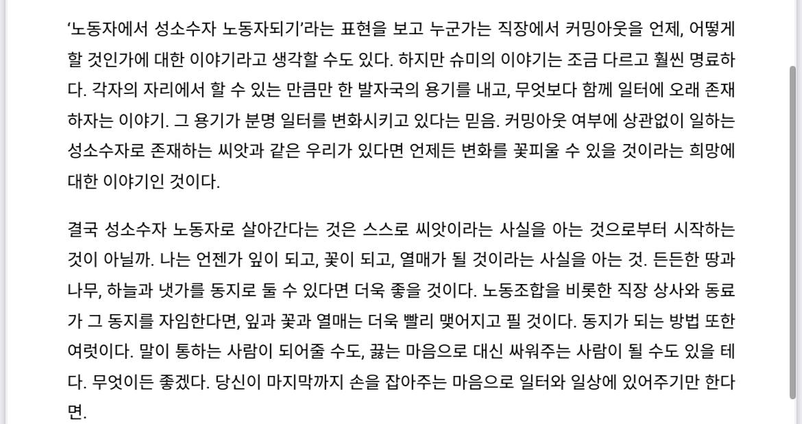 이번 총회를 기점으로 이제 운영위원을 떠납니다. 아쉽습니다. 그렇지만 에너지가 남은 상태에서 운영위원을 그만 둬야 앞으로 행성인의 더욱 많은 자리에서 저의 역할을 찾아갈 수 있을 것이라고 생각하기에 즐거운 마음으로 떠나려고 합니다. 그동안 제가 운영위원을 하는데 도움을 줬던 수많은 행성인에게 감사의 마음을 진하게 남깁니다. 혼자라면 완수하지 못했을 것입니다. 다시 한번 감사합니다. 더불어, 성소수자 운동에 관심있는 행성인이라면 꼭 운영위원이 아니더라도 행성인에서 자기 자리를 찾았으면 좋겠습니다.😘 차가운 세상에서 우리끼리라도 따스한 곁을 내주는 동료가 됩시다. 더욱 다양한 자리에서 만날 수 있길 기대하겠습니다. 우리 백년만년 행복하게 살아요.❤️