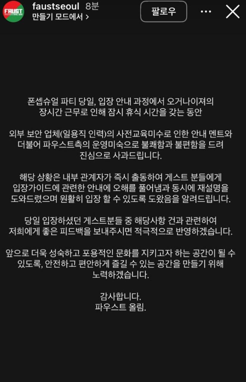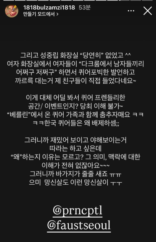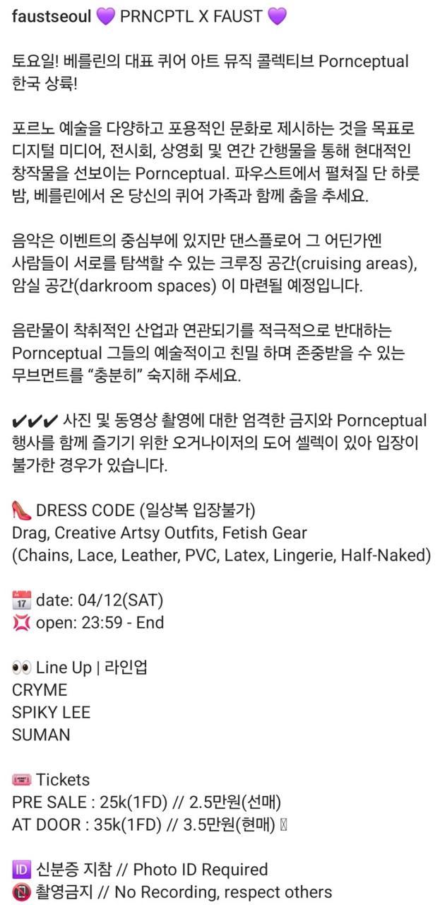 하지만 일말의 기대는 때때로 현실의 벽 앞에서 무력하게 좌초하기도 합니다. 제가 올해 4월 초에 경험했던 한 유명 테크노 클럽에서 열린 파티는 그 씁쓸한 단면을 여실히 보여주었습니다. 그들은 "포르노 예술을 다양하고 포용적인 문화로 제시"하고 "베를린에서 온 당신의 퀴어 가족과 함께 춤을 추자"는 도발적인 슬로건을 내걸었습니다. 나아가 "음란물이 착취적인 산업과 연관되기를 반대"하며 자신들의 "예술적이고 친밀하며 존중받는 무브먼트"를 충분히 숙지하고 참여해달라고 요청했습니다. 탈권위와 성적 권력의 전복을 표방하며, 컨셉 부적합 시 '오거나이저의 도어 셀렉으로 인한 입장 거부' 가능성까지 공지했죠. 표면상으로는 음지의 포르노와 성문화를 양지로 끌어올려 차별에 맞서고, 모두의 안전한 성적 권리 행사를 보장하는 공간을 만들겠다는 급진적인 '퀴어한' 기획처럼 보였습니다.