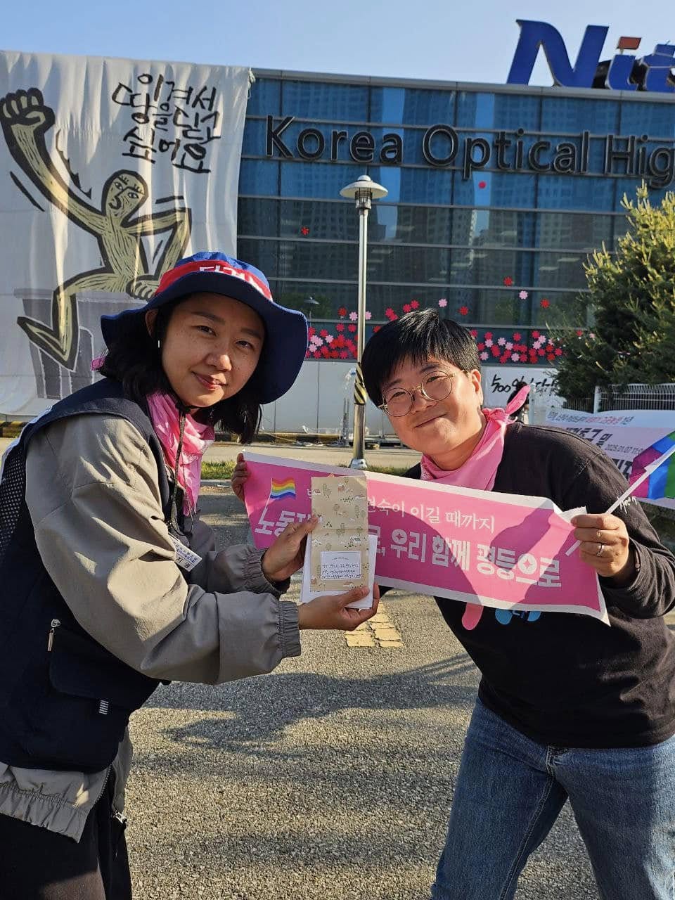 구미 한국옵티칼에 행성인 노동권팀에서 십시일반 모아준 연대투쟁기금 전달하였습니다. 박정혜,소현숙 동지와 다섯명의 조합원 동지들 만나고 가는 길이 편하지만은 않습니다. 우리 각자의 자리에서 계속 함께 싸우면 좋겠습니다. 애타게 싸우는 동지들이 외롭지 않게 많이 응원해주시고 관심 가져주세요. 고공노동지들이 땅을 밟을 수 있게, 새로운 민주주의를 위해!!