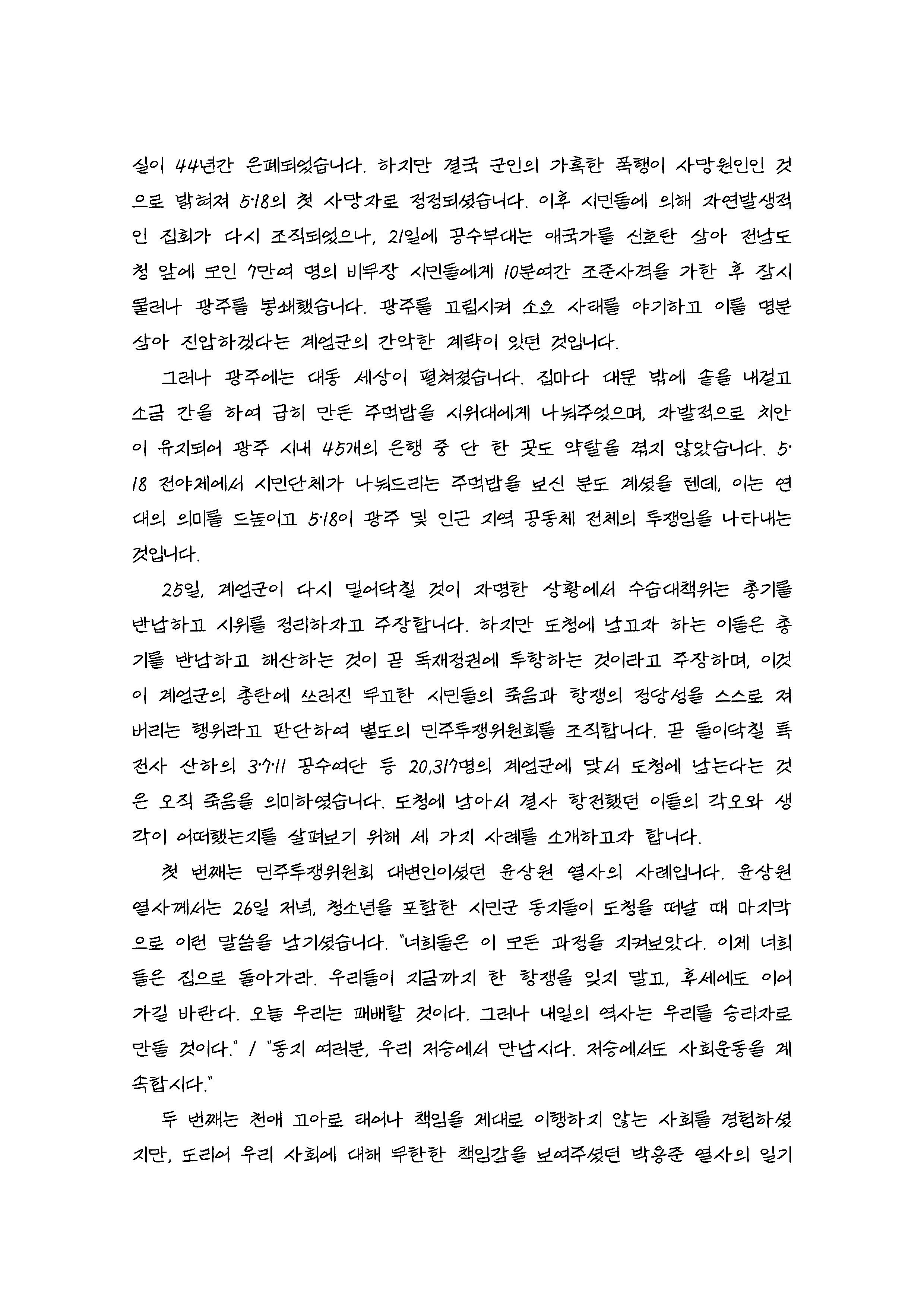 두 번째는 천애 고아로 태어나 책임을 제대로 이행하지 않는 사회를 경험하셨지만, 도리어 우리 사회에 대해 무한한 책임감을 보여주셨던 박용준 열사의 일기입니다.1 21일 밤 “오늘 오후 그들은 드디어 우리를 향해 사격을 가했다. 쓰러지는 우리 학생 시민들 품에 번지는 피! 그들이 우리의 피를 원한다면. 이 조그마한 한 몸의 희생으로 자유라는 대가를 얻을 수 있다면, 나는 희생하겠다. 헬기 소리, 또 총소리. 싸우다 쓰러져간 우리 학우 그리고 광주 시민. 나도 부끄럽지 않게 일어서리라.” / 도청으로 계엄군이 진입하기 직전 마지막 일기 "하느님, 왜 저에게는 양심이 있어 이토록 저를 찌르고 아프게 하는 것입니까? 저는 살고 싶습니다.“