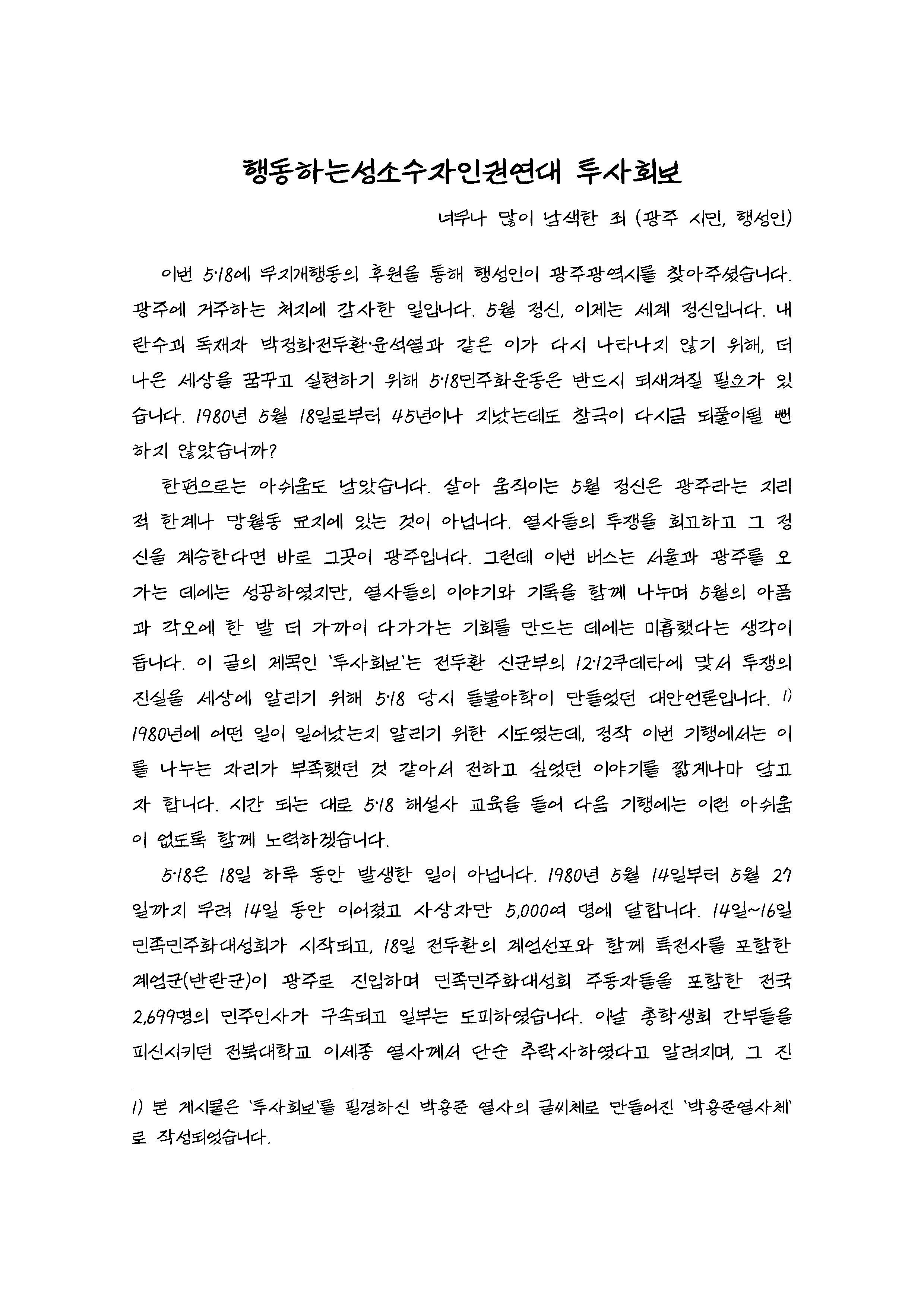 5월의 의미를 잊지 않고 기억하는 우리 또한 항쟁에 동참한 것과 다름없습니다. 열사들의 부르짖음대로 그날의 피, 눈물, 다짐을 잊지 않았기에 5·18민주화운동이 마침내 승리한 것입니다. 성소수자 운동의 역사에도 기억해야 할 동지들이 있습니다. 대학동성애자인권연합의 오세인 활동가, 동성애자인권연대의 육우당 활동가, 대한민국 육군 변희수 하사님, 매년 행성인의 추모테이블에 오르는 희영 · 영훈 · 키디다 · 크리스 · 찬혁 · 느루 · 도진 · 은용 · 희수 · 신엽 · 나환 · 김무명 · 이연수 · 임보라님, 광주에서 저와 함께 활동했던 광주광역시성소수자모임폴라리스의 디온… 그리고 사회에 의해 자행되었으나 장례도 제대로 치르지 못하고 알려지지도 못한 수많은 성소수자의 죽음. 5·18을 통해 우리의 깃발에 무엇을 아로새겨야 할까요? 사그라들었던 생명의 불꽃을 다시 풀무질하고, 그 찬란함을 증언하고, 염원을 이루는 것은 이제 우리의 몫입니다. 성소수자 인권 쟁취의 끝이 지금은 보이지 않고 풍전등화 같을지라도, 우리의 운동은 반드시 승리합니다. 혐오와 압제, 차별에 맞서 서로를 감싸안고, 앞서서 나가신 분들께 포괄적 차별금지법과 생활동반자법 등 더욱 평등한 사회의 실현을 보여드리기 위하여. 우리 삶의 불꽃이 더욱 빛나기 위하여. 산자는 그 길을 따라 행동하여 세상을 바꿉시다!