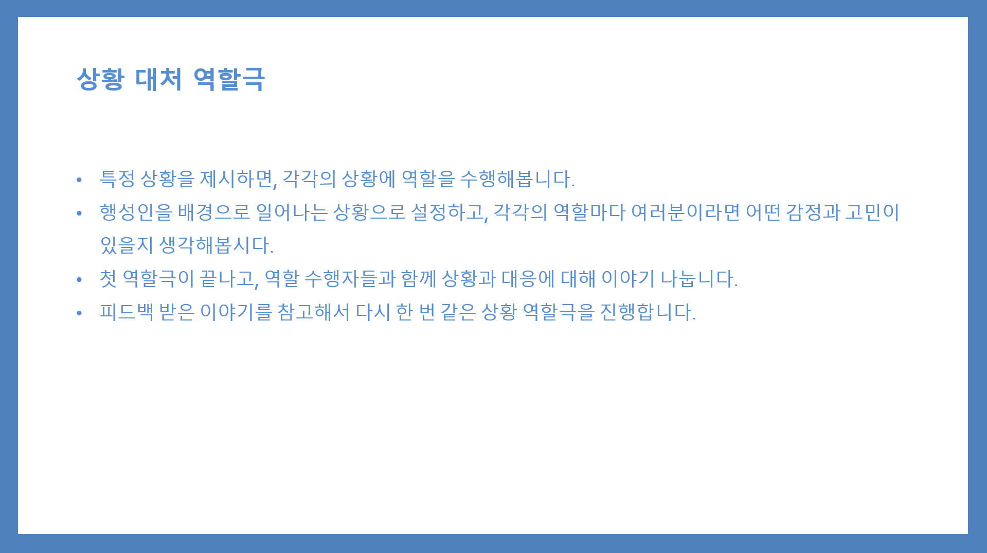 이어지는 프로그램에서는 행성인에서 일어날 수 있는 상황들을 설정하여 역할극을 진행했습니다. 주어진 상황마다 역할을 갖고 맞닥뜨린 상황을 어떻게 대처해왔는지, 더 좋은 방법은 무엇이 있는지 이야기 나눴습니다.