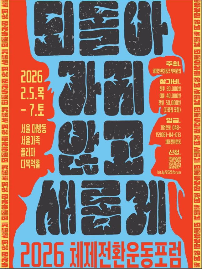 지난 2월 5일-7일 사흘간, 서울가족플라자에서 2026 체제전환 운동포럼이 열렸습니다. 세계 곳곳에서 전쟁과 학살, 불평등이 점증하고 있는 가운데, 서로 다른 운동의 통찰과 도전을 공동의 전망으로 만들기 위해 열린 자리였습니다. 포럼에는 사흘간 12개의 세션에 연인원 약 800명이 함께하며 성황리에 마무리되었는데요. 행성인 상임활동가 지오가 개막식 연대발언으로 함께 하였습니다. 아래 발언 전문을 공유합니다.