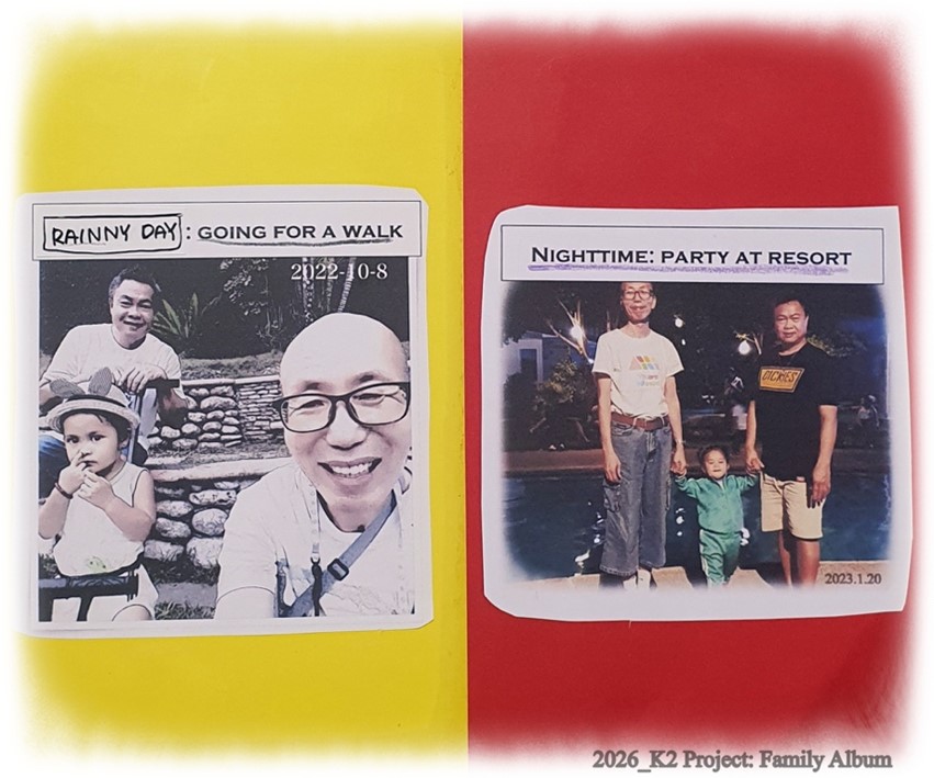 첫 작업 단계에서 온 가족이 함께 찍은 사진을 선별하여 프린터로 출력했습니다. 우선 겉표지는 단단한 것이 필요했는데 마침 예전에 아이가 그렸던 스케치북 표지를 버리지 않고 보관해 놓은 것이 있어서 이것을 재활용했어요. 앨범의 표지 사진은 뭐니 뭐니 해도 레인보우 깃발이 나온 사진으로 떡하니 걸었습니다.
