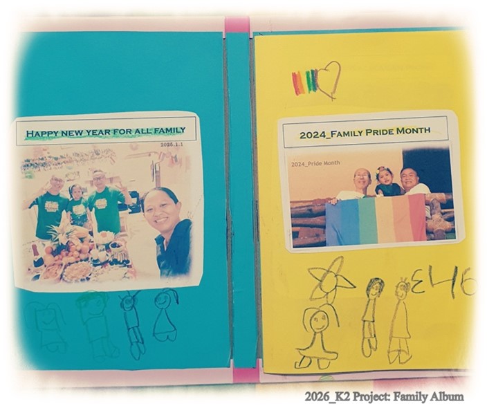 바로 옆 사진은 자긍심의 달 6월에 찍은 사진입니다. 제 사무실 발코니에 무지개 깃발을 걸어 놓고 한 컷 찍었지요. 사진을 붙이고 아이는 빈 공간에 엄마, 아빠, 인보 그리고 조안 이모까지 그려 넣더라고요.