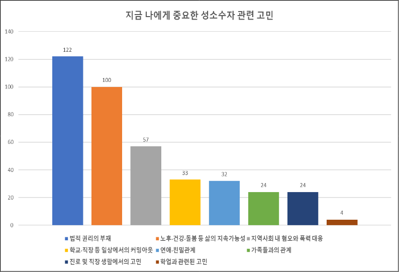 법·정책 제도 개선 활동이 1위 응답수(63명)와 1~3위 응답수 합계(120명) 모두 가장 많은 응답을 기록하였는데, 이는 앞서 살펴본 ‘지금 나에게 중요한 성소수자 관련 고민’ 과 같이 차별금지법, 혼인평등 제도의 부재 등 한국 성소수자 운동의 현실을 반영한 결과로 분석됩니다.