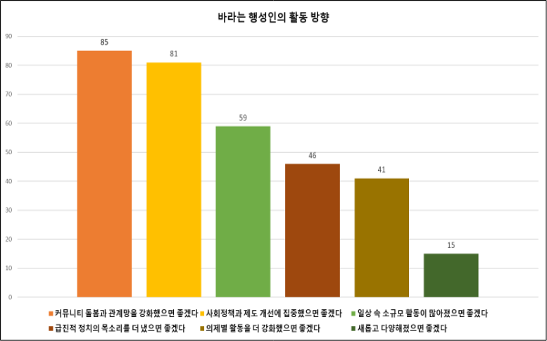 바라는 행성인의 활동 방향을 객관식으로 물었습니다. 커뮤니티 돌봄과 관계망 강화 85명, 사회정책과 제도 개선 집중 81명 등 전반적으로 위 ‘앞으로 행성인이 더 집중했으면 하는 활동’ 응답과 비슷한 결과를 보입니다. 그 외에 일상 속 소규모 활동의 증가가 59명으로 눈에 띕니다.