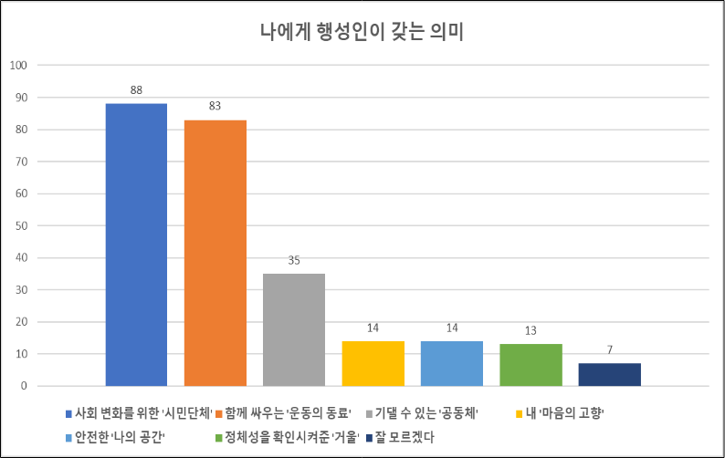 ‘나에게 행성인이 갖는 의미’를 객관식으로 물었습니다. 행성인은 사회 변화를 위해 함께 싸우는 동료로서의 이미지가 강함을 확인할 수 있습니다. 이는 위 ‘행성인 하면 떠오르는 이미지’ 질문에서 ‘활동이 활발한 운동 조직’ 응답이 높았던 것과 결을 같이 합니다.