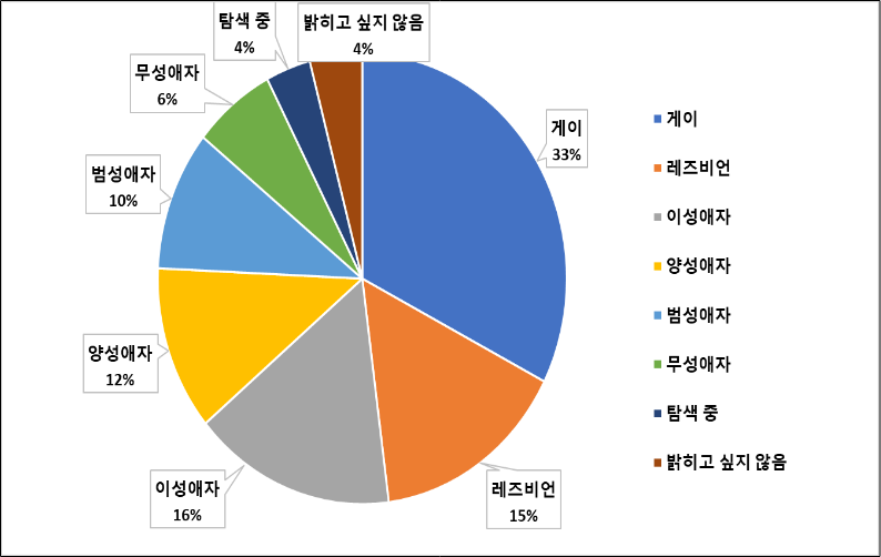 응답자의 성적 지향 분포는 게이 55명(32.5%), 레즈비언 26명(15.4%), 이성애자 27명(15.6%), 양성애자 20명(11.8%), 범성애자 17명(10.1%), 무성애자 11명(6.5%), 탐색중 6명(3.6%), 밝히고 싶지 않음 7명(4.1%)으로 나타났습니다.
