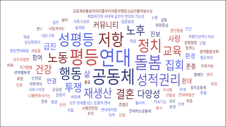 마지막으로 행성인이 지향하기를 바라는 키워드를 주관식으로 물었고, 이를 응답값이 클수록 글자가 커지는 워드 클라우드 형식으로 정리하였습니다. 연대(76건)가 압도적으로 높은 응답을 기록했으며, 평등(53건), 공동체(48건), 돌봄(37건), 저항(31건), 성평등(23건), 정치(21건), 행동(18건), 성적권리(15건), 노동(12건)이 뒤를 이었습니다.