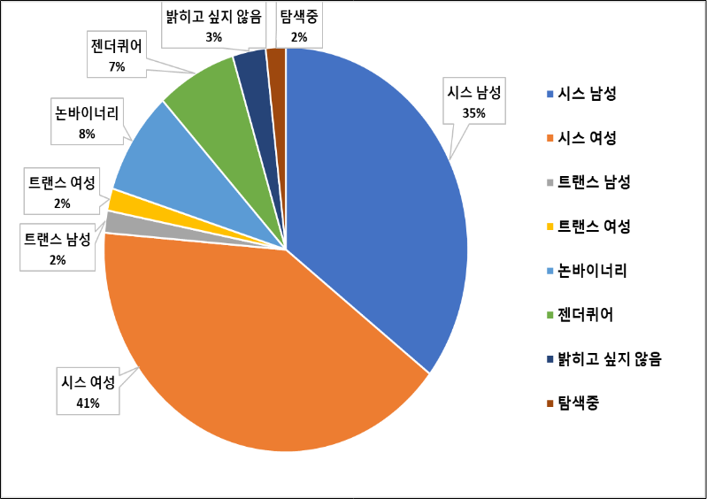 응답자의 성별 정체성 분포는 시스 여성 69명(40.8%), 시스 남성 60명(35.5%), 트랜스 여성 3명(1.8%), 트랜스 남성 3명(1.8%), 논바이너리 14명(8.3%), 젠더퀴어 12명(7.1%), 탐색중 3명(1.8%), 밝히고 싶지 않음 5명(3.0%)로 나타났으며, “당신은 트랜스젠더로 정체화하고 있습니까?”라는 질문에는 예 21명(12.4%), 아니오 148명(87.6%)로 응답하였습니다.