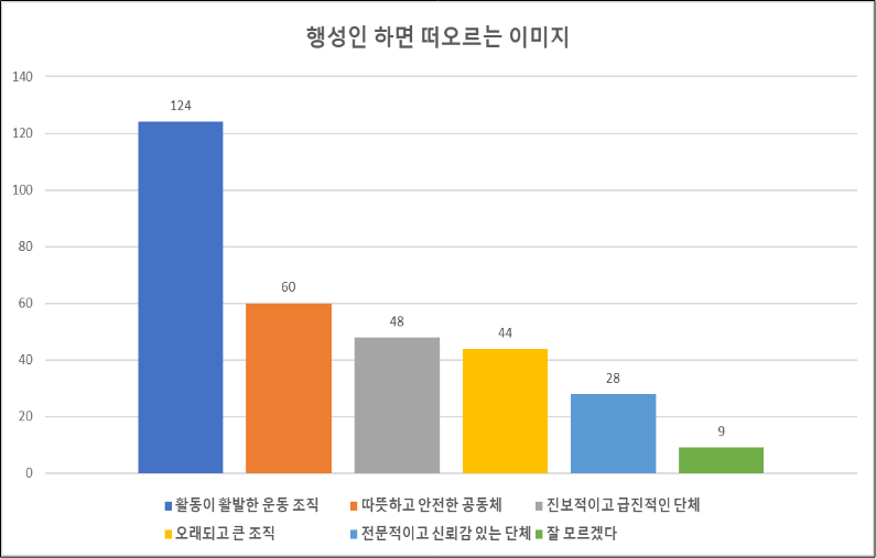 ‘행성인 하면 떠오르는 이미지’를 객관식으로 물었습니다. ‘활동이 활발한 운동 조직’ 이 압도적으로 1위(73.4%)를 기록하였으며, ‘따뜻하고 안전한 공동체’(35.5%), ‘오래되고 큰 조직’(26%), ‘진보적이고 급진적인 단체’(28.4) 순으로 뒤를 이으며 행성인에 대한 이미지가 확고하게 자리 잡았음을 확인할 수 있었습니다.