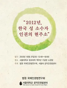 모리 (동성애자인권연대 웹진기획팀) 10월 28일, 법원 국제인권법연구회와 서울대학교 공인인권법센터가 공동으로 주최한 “2012년 한국 성 소수자 인권의 현주소”라는 학술대회에 다녀왔습니다. 대부분 판사, 법대 교수, 법원 상임연구원 등 무서운(?) 사람들이었지만 아는 얼굴도 많았습니다. 100명 가량이 참석해 성소수자 인권에 대한 관심을 보였습니다. 이번 학술대회는 나영정 연구원(성적지향 성별정체성 법정책연구회 상임연구원), 김선일 판사(춘천지방법원 원주지원장), 이준일 교수(고려대 법학전문대학원)의 성소수자의 법제와 현실에 대한 발표와, 한가람 변호사(희망을 만드는 법), 홍춘의 교수(전북대 법학전문대학원), 정지원 판사(서울가정법원)의 지정토론, 마지막으로 종합토론으로 진행됐습니다. 학술대회는 나영..